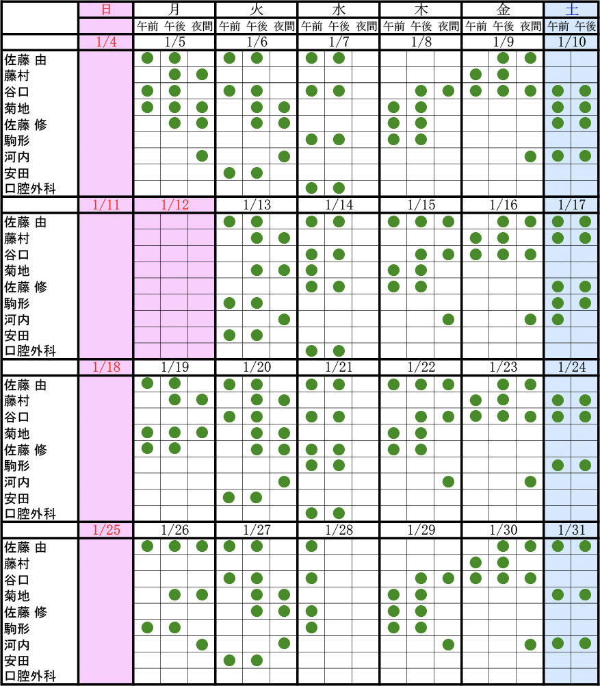 無料低額診療事業 無料低額診療事業は、生計困難な方が、経済的な理由によって必要な医療を受ける機会を制限されないように、無料または低額で医療をうけられる制度です。 新着情報 2026年1月7日 NEW! 診察スケジュールを更新しました。 2026年1月1日 新年のご挨拶 2026 2025年11月28日 診察スケジュールを更新しました。 2025年10月31日 診察スケジュールを更新しました。 2025年9月29日 診察スケジュールを更新しました。 2025年8月29日 診察スケジュールを更新しました。 2025年7月16日 【お仕事体験の参加募集】お仕事体験 in 古川民主病院歯科のお知らせ 2025年7月14日 【講演会のご案内】「子どもの口からみえる、子どもがおかれている環境」 〜子どものむし歯予防がもたらすもの〜(9月21日開催) 2025年6月30日 診察スケジュールを更新しました。 2025年6月2日 診察スケジュールを更新しました。 休日救急歯科診療について 大崎歯科医師会の大崎口腔保健センターにて対応しております。 大崎歯科医師会のホームページはこちら>> 院内掲示について 施設規準の届出について>> 総義歯治療の皆様へ>> 居宅療養管理指導の重要事項>> – 診療時間 – – 診療スケジュール – ※画像をクリックすると、詳細をみることができます。 ドクターとスタッフブログ 歯科のご案内 医師・スタッフのご紹介 設備 施設案内 アクセス はじめての方へ 診療手順 診療科目 一般診療・小児歯科 有病者治療 矯正 在宅往診 口腔外科 インプラント 歯科医師臨床研修 歯科医師臨床研修 リクルート 私たちの職場 歯科衛生士からのメッセージ FAQ 募集要項 歯科医師・歯科衛生士の募集をしております。関心がある方は、求人募集の特設サイトをご覧ください。 リンク